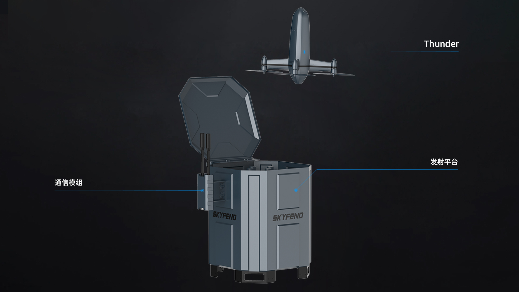Thunder 是一款端到端的人工智能截击机产品, 可以自主导航并有效拦截固定翼等潜在无人机威胁。 Thunder 能够根据地面传感器指引, 自主规划拦截航线并飞向威胁目标。 结合内置高精度视觉识别算法, Thunder 可自主锁定并完成拦截任务。
